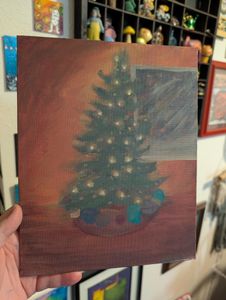 Acrylic painting of a Christmas tree lit up with warm white lights, illuminating the presents under the tree and the snow storm outside